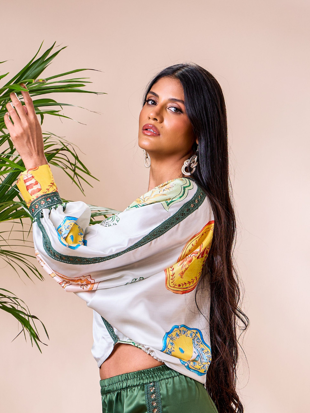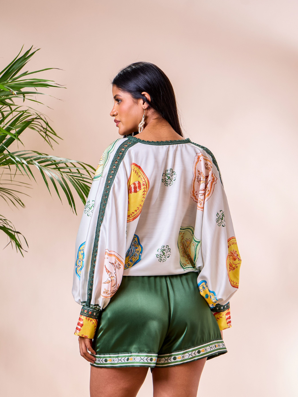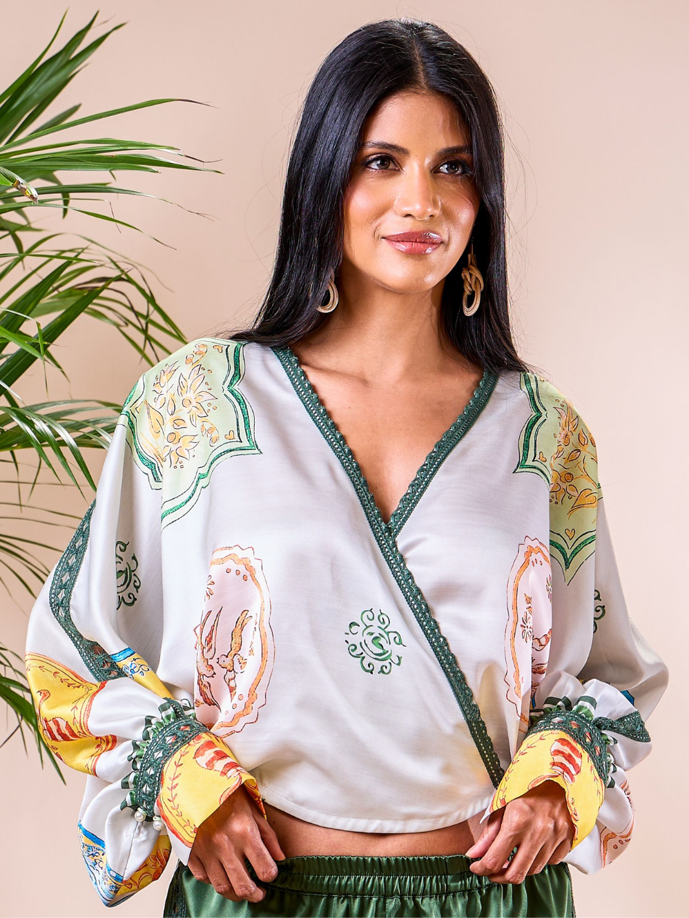 The Adella Top Glam features a cross-over V-neckline and voluminous sleeves. This top is beautifully detailed with artistic medallion print and a contrasting trim, making it the perfect piece to elevate both casual and sophisticated looks.