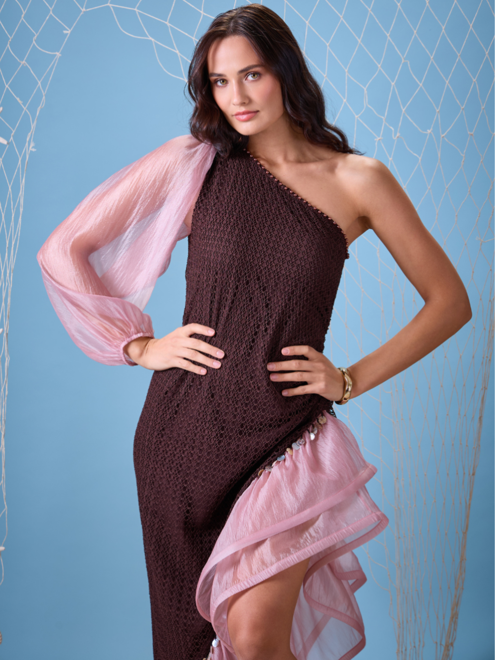 The Ariel Dress is an elegant one-shoulder asymmetrical design that exudes feminine allure. It features a voluminous sheer puff sleeve on one side and a skirt with a cascade of flowing pink ruffles, delicately trimmed with light-catching beadwork for a touch of radiant movement.