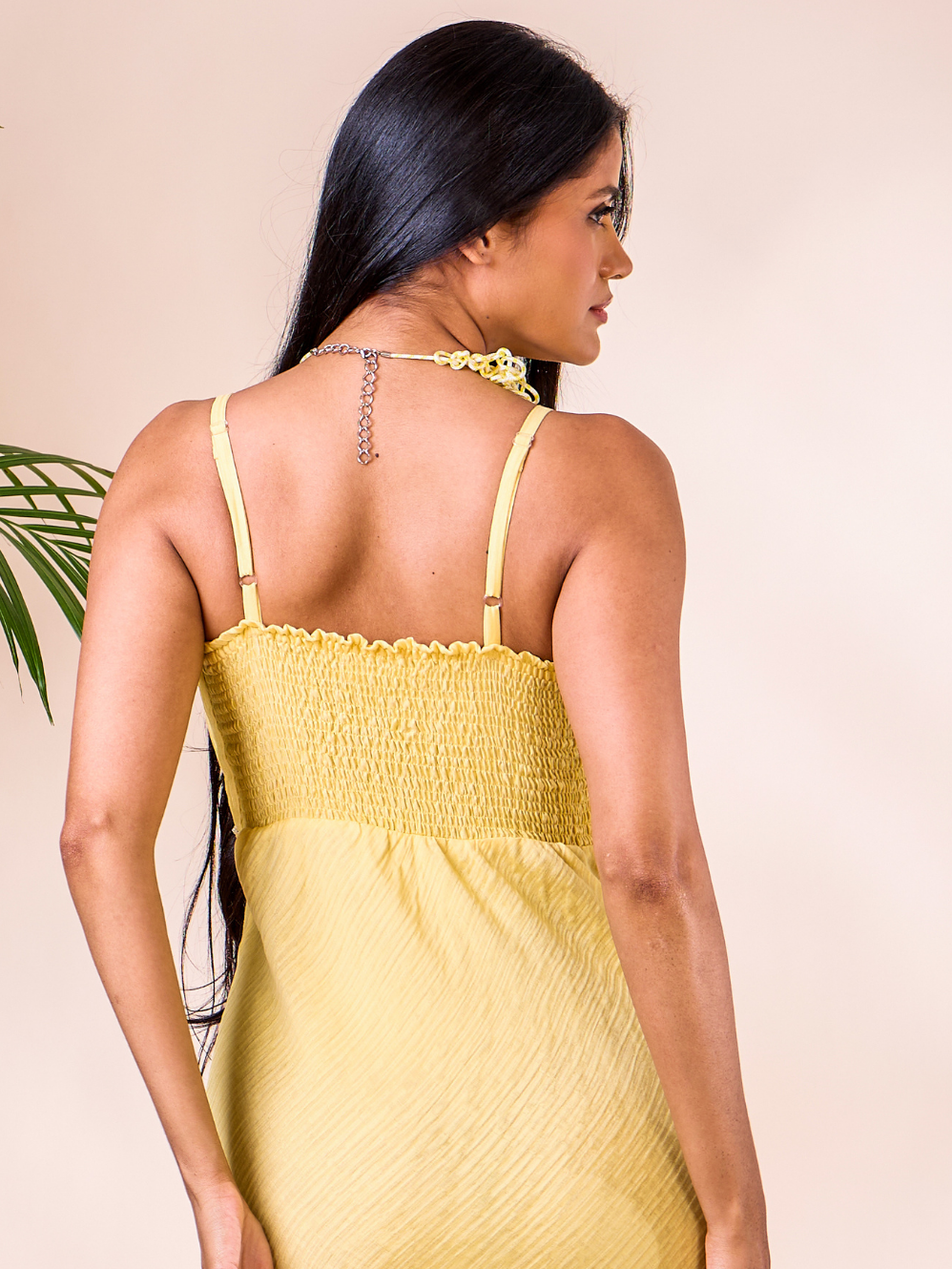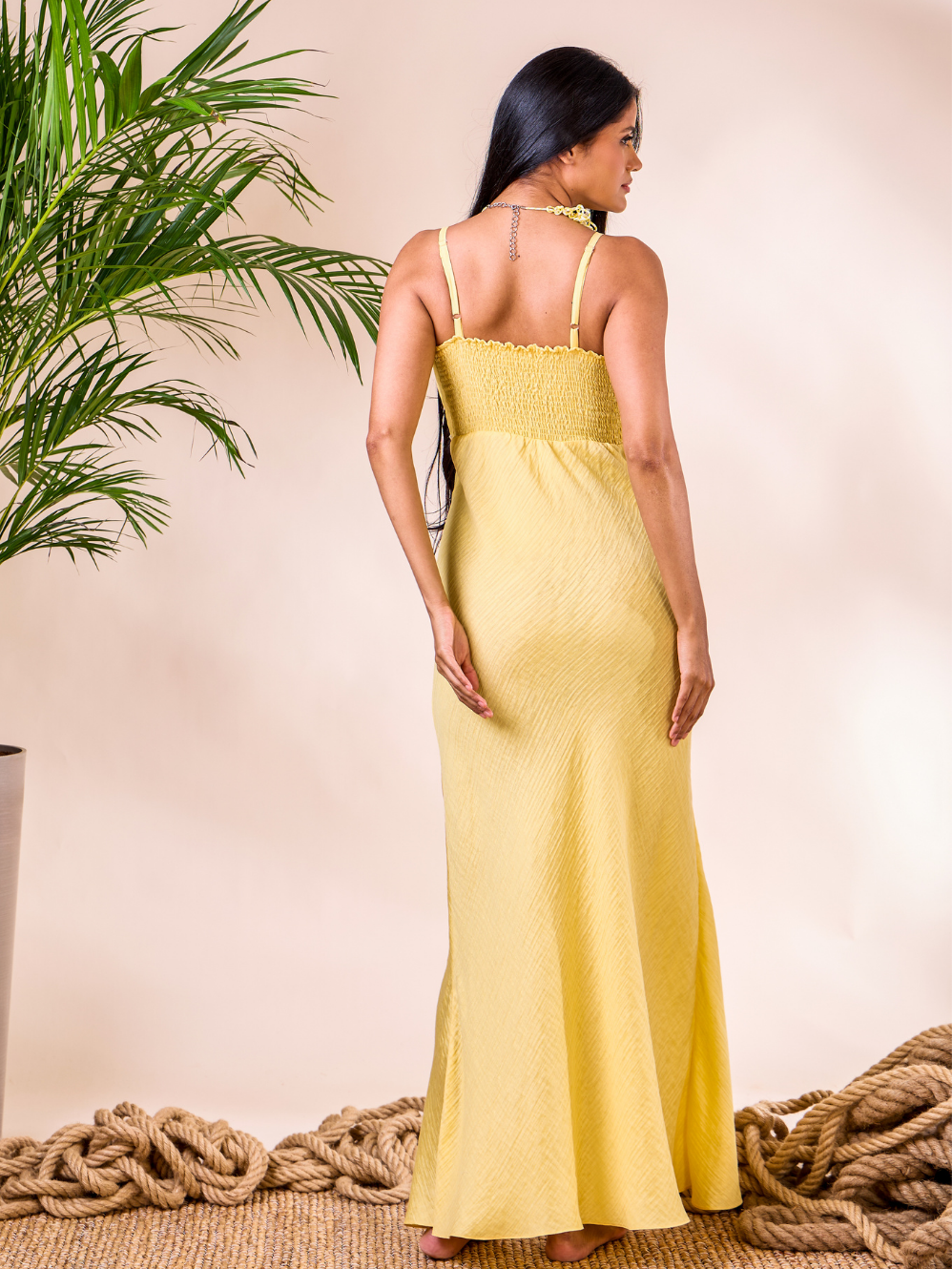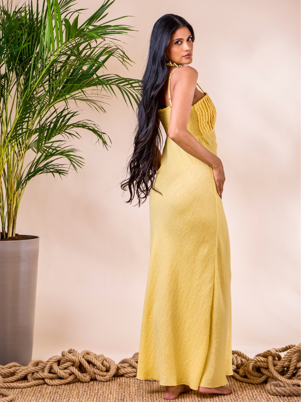 The Attina Dress is an elegant floor-length gown that radiates understated sophistication. Designed with a structured pleated bodice and delicate shoulder straps, it flatters the neckline while flowing effortlessly into a graceful A-line silhouette. The soft yellow hue adds a touch of warmth and luminosity, perfect for sunlit gatherings or evening soirées.