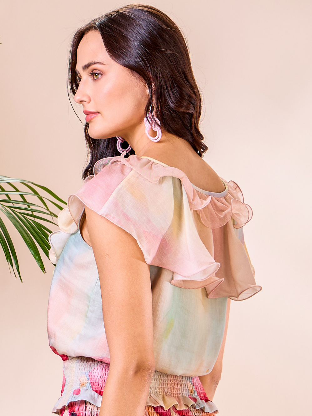 The Bloom Top features a V-neckline framed by double-layered ruffles that cascade over the shoulders, forming delicate flutter sleeves. The smocked hemline creates a soft blouson effect, adding effortless volume to the silhouette.