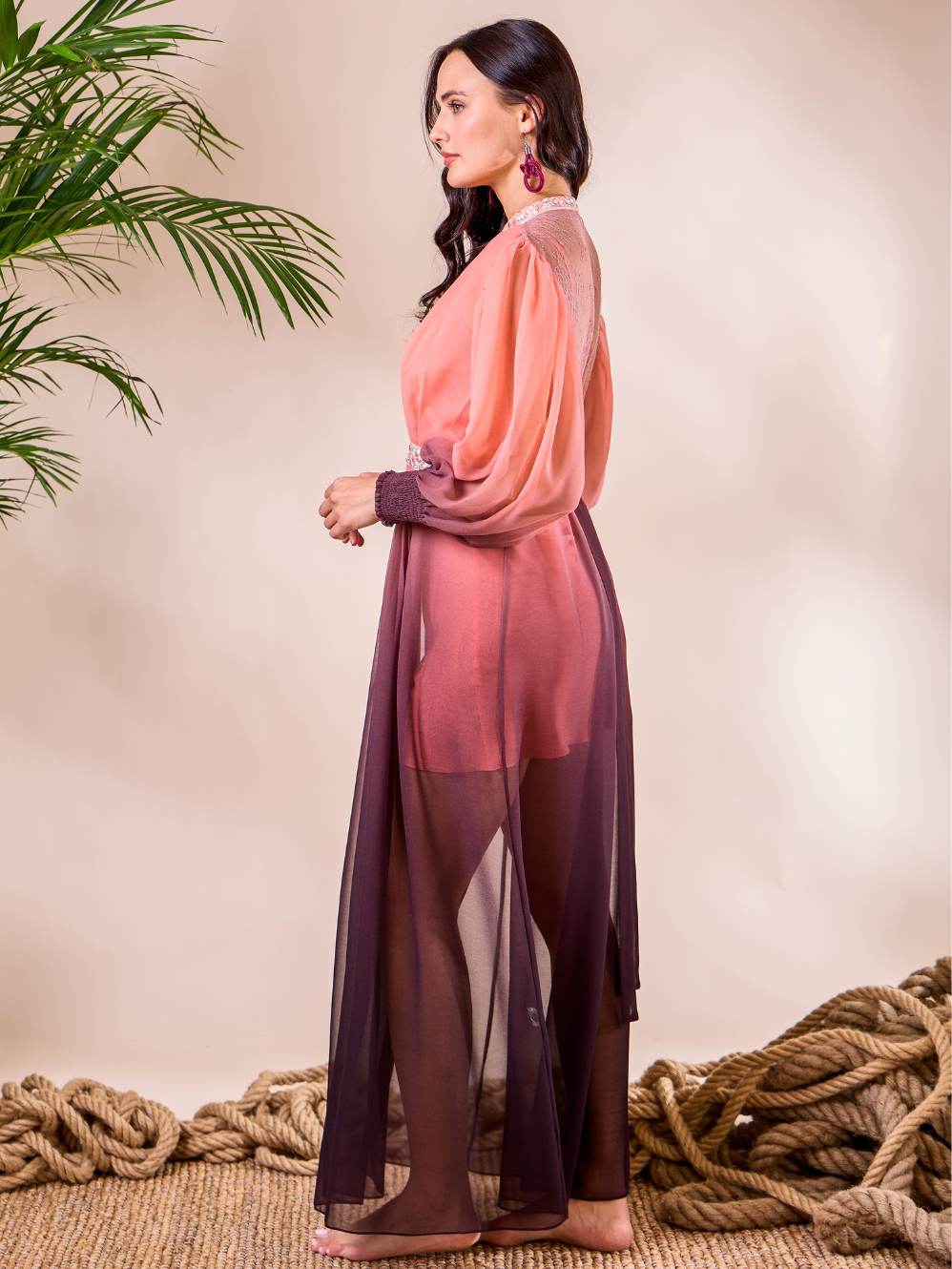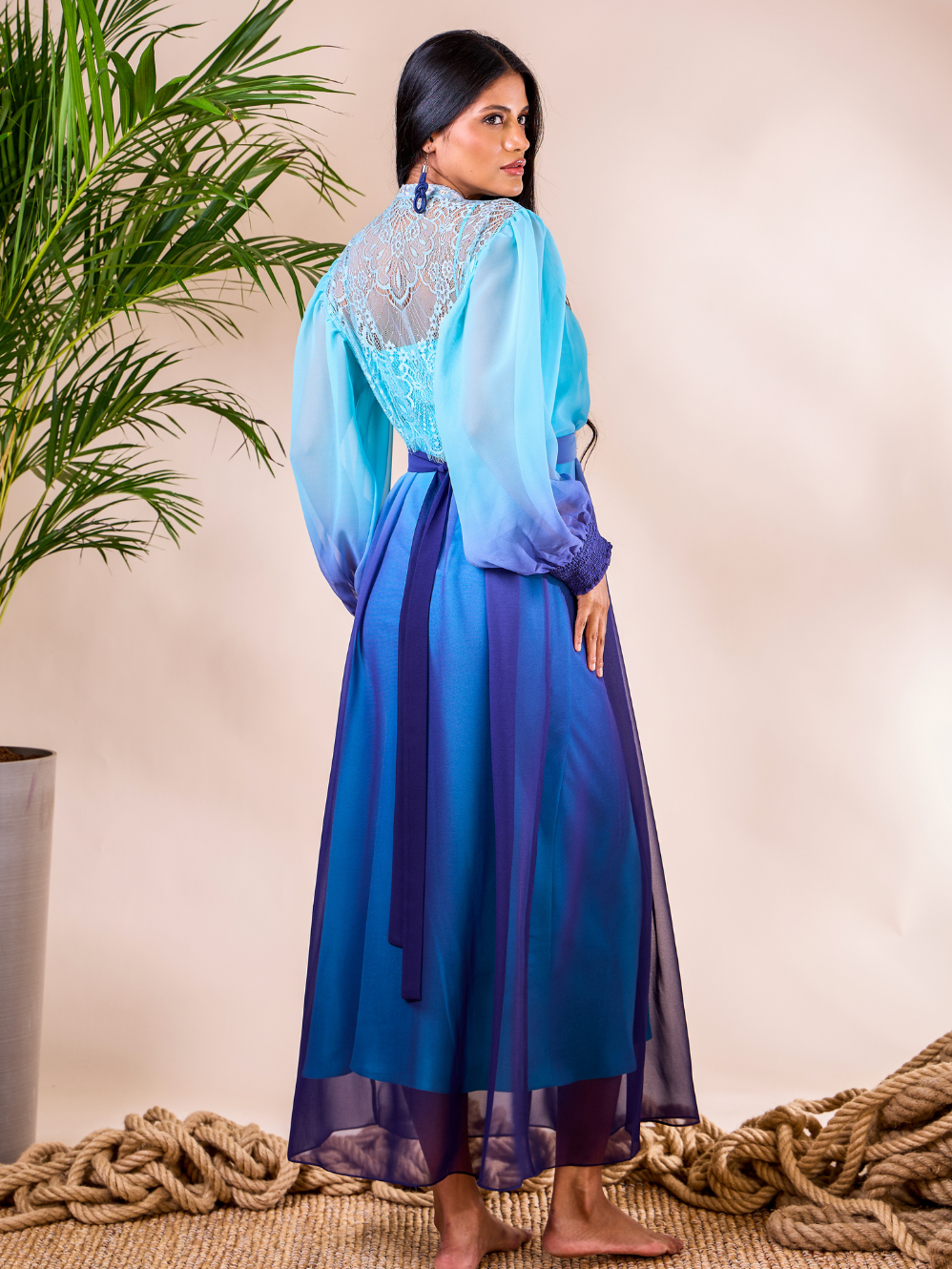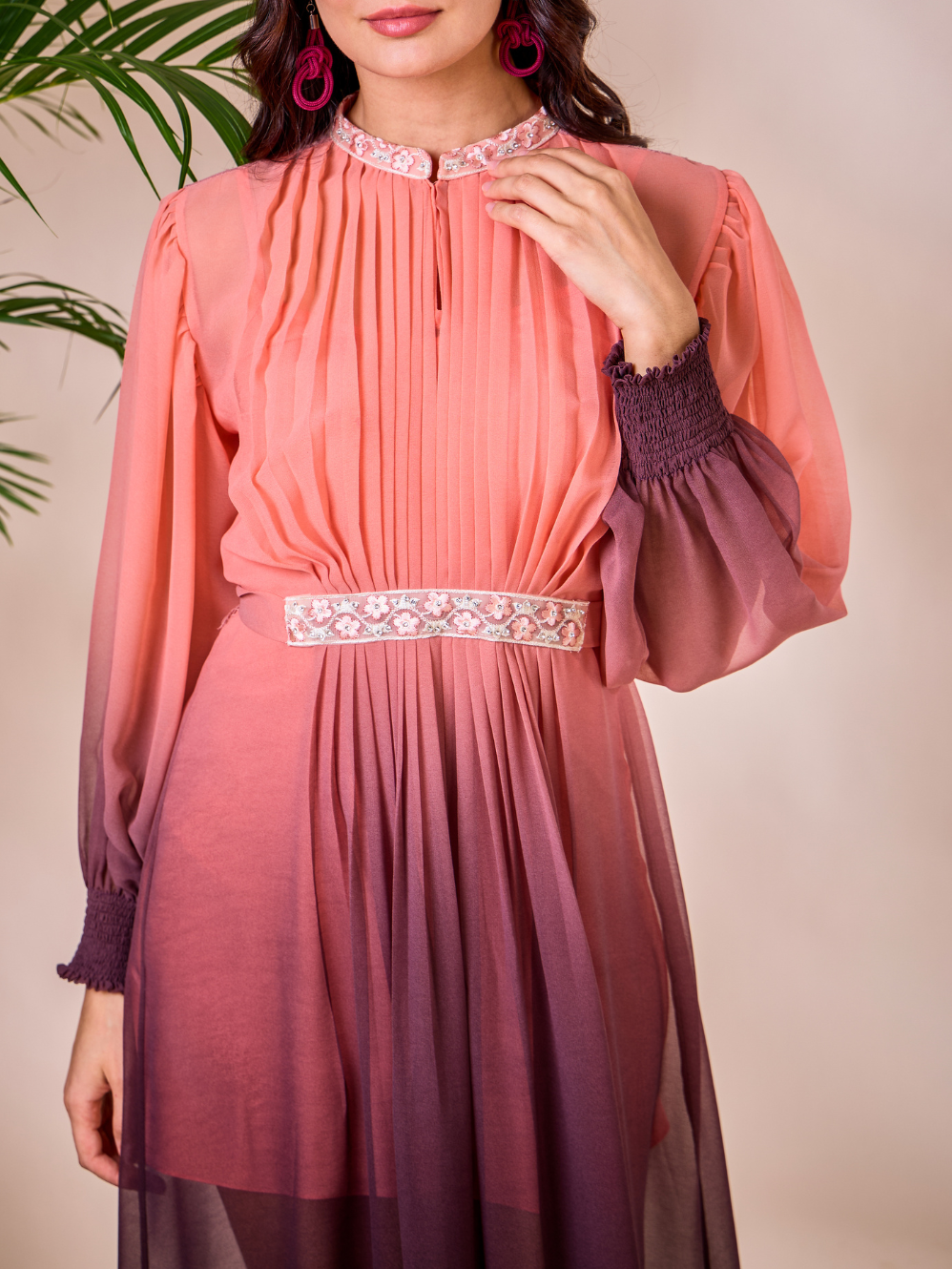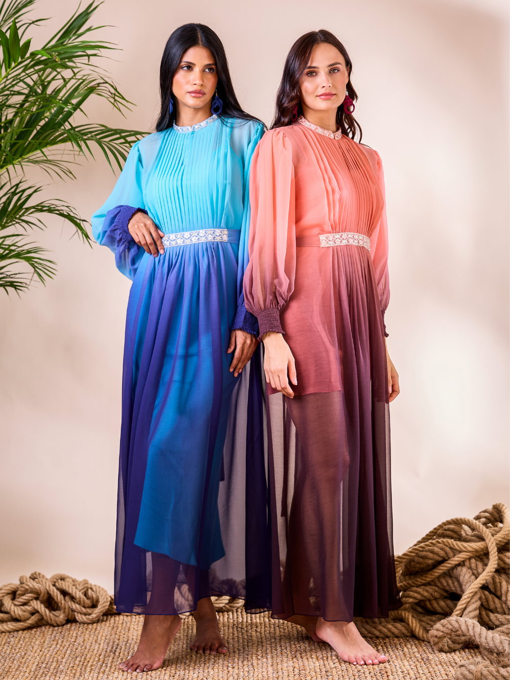 The Calypso Dress Glam is a full-length ombré gown crafted from sheer, flowing fabric that moves gracefully with every step. The bodice features a delicately pleated yoke and a refined high neckline, contrasted by voluminous bishop sleeves. A statement embellished belt completes the look, creating a perfect piece for sophisticated evening occasions or elevated resort soirées.