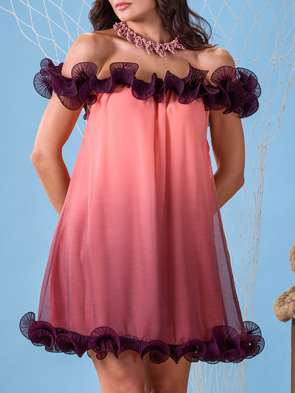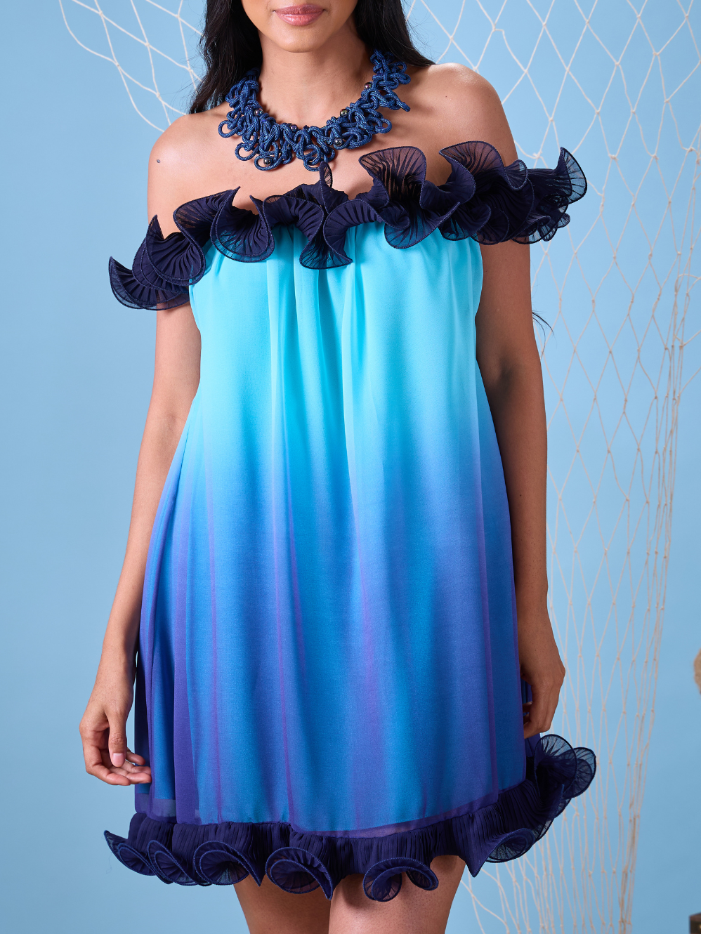 The Calypso Dress Short is a charming mini dress crafted from lightweight chiffon in stunning ombré tones. It features an off-the-shoulder neckline and ruffled hemline that add volume and movement, creating a playful yet elegant silhouette perfect for sun-drenched getaways.