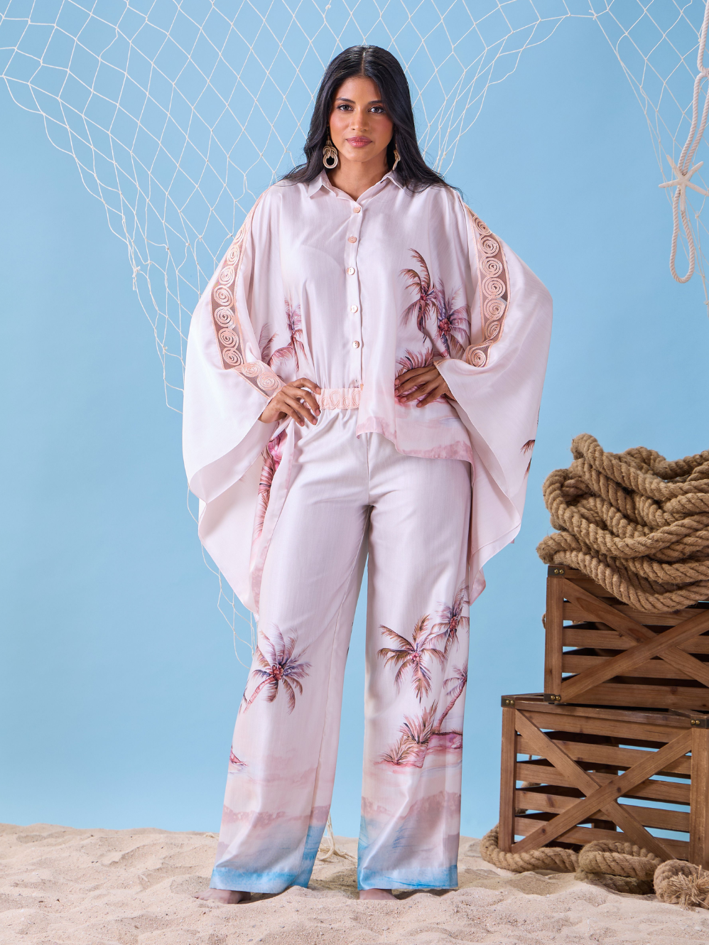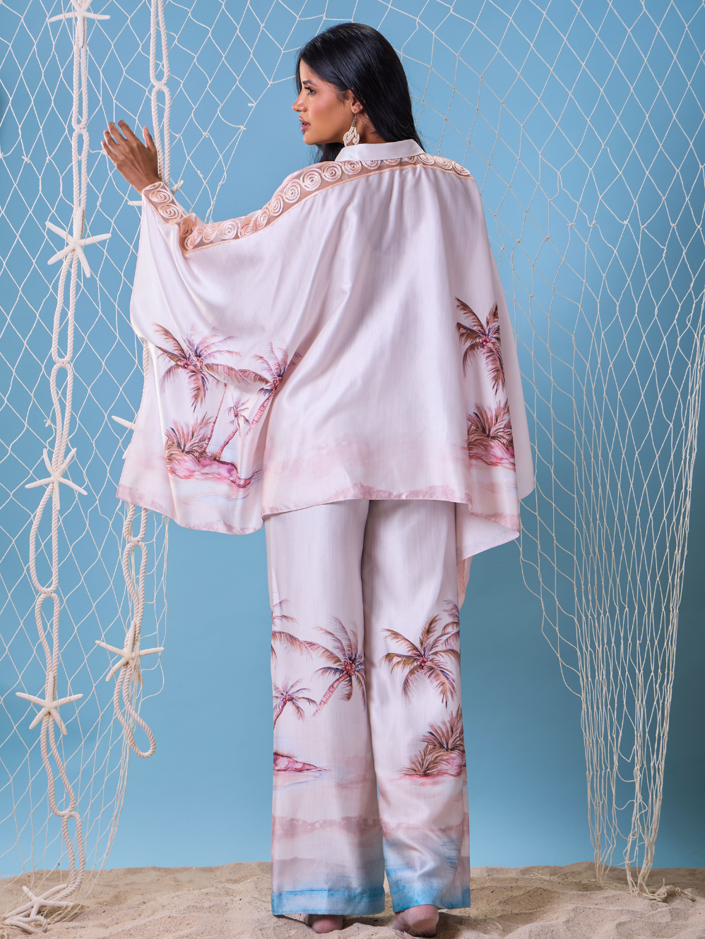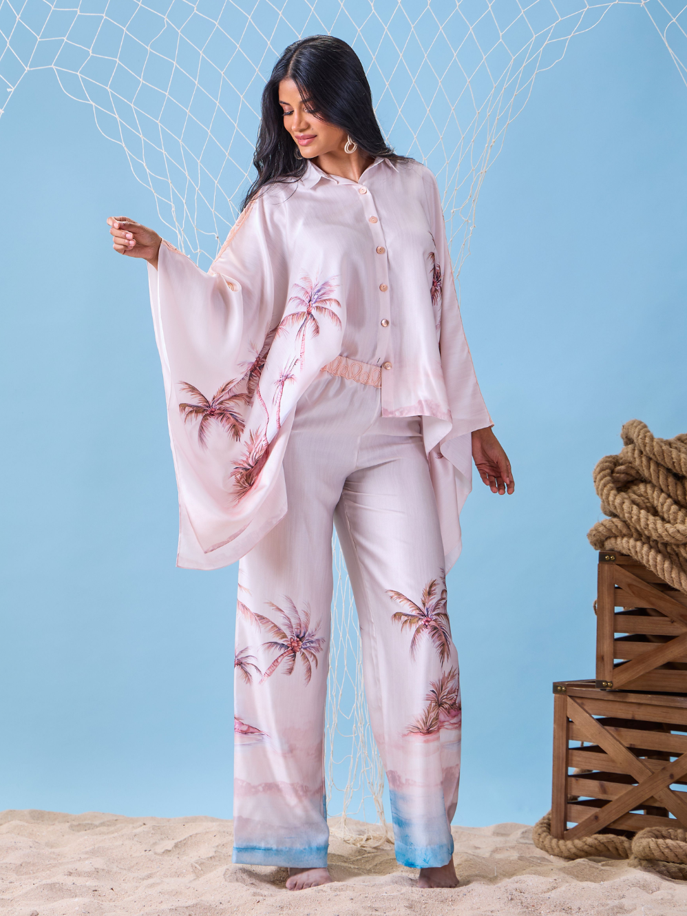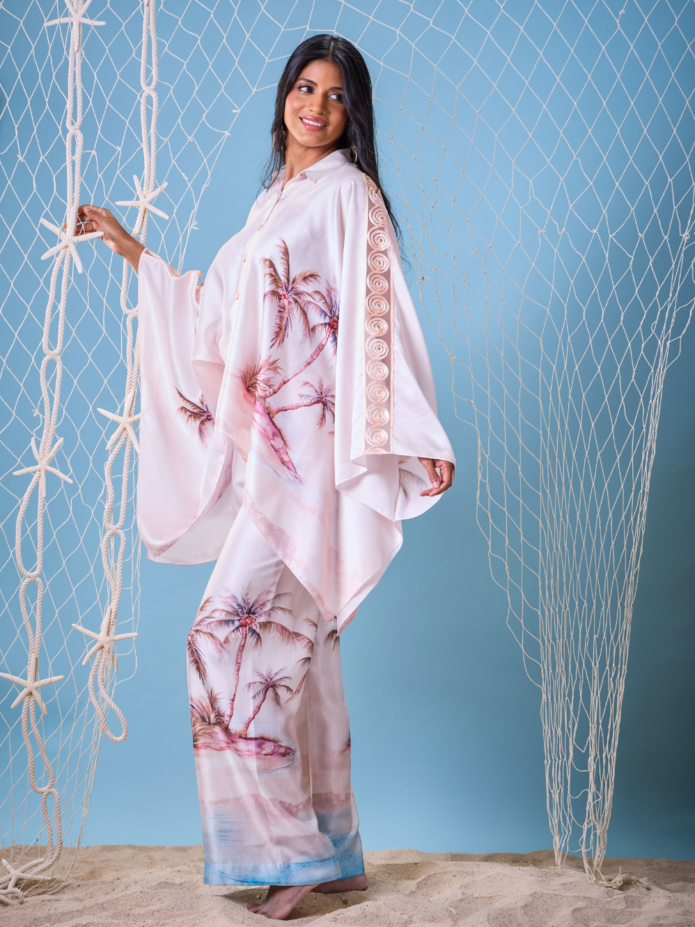 The Cove Top is a modern take on the classic button-down. Designed with wide, kimono-style sleeves, it offers a chic and relaxed drape. The soft palm and ocean motif evokes the tranquility of resort living, perfect for your sunlit escapes.