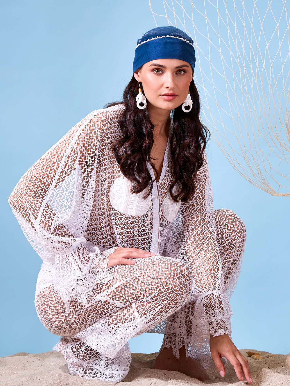 The Delphine Top is a breezy, sheer button-down design featuring a relaxed fit and oversized sleeves. Its standout detail are the delicate seashell appliqués across the bust, adding a whimsical and nautical touch to this perfect statement beach cover-up.