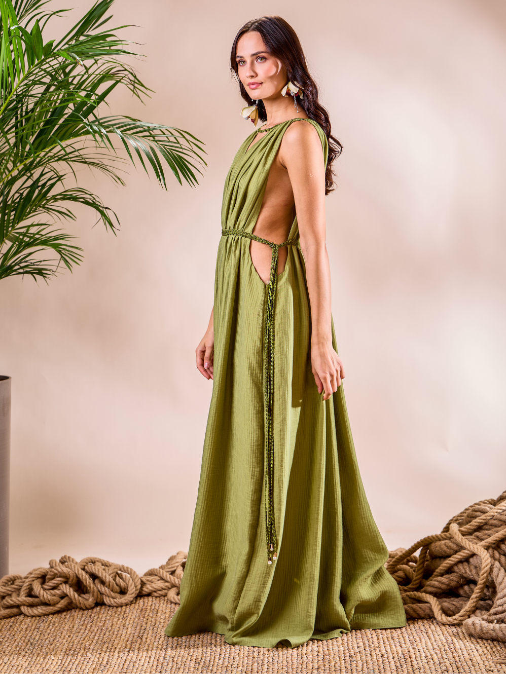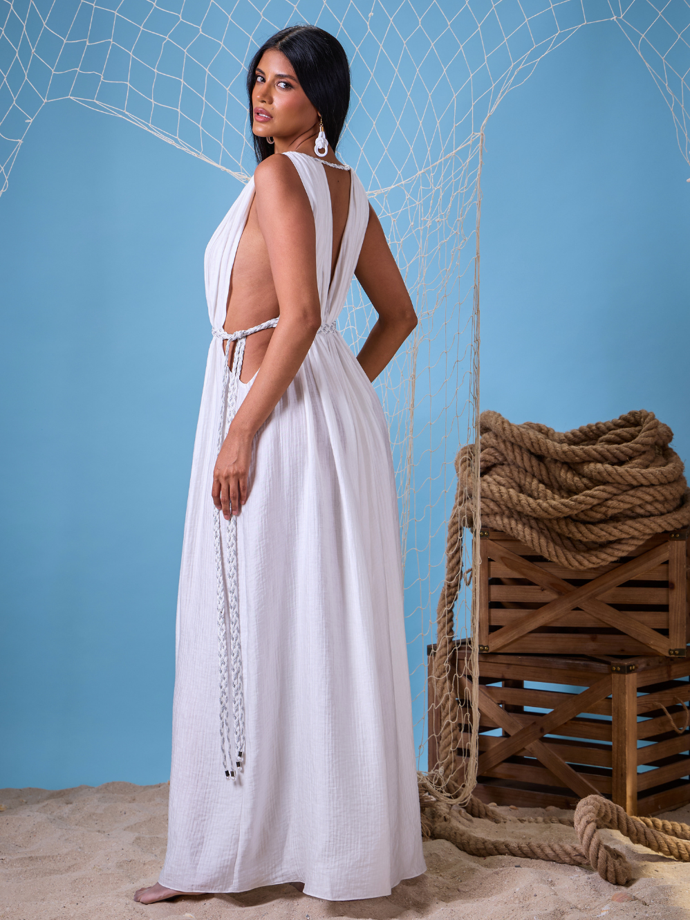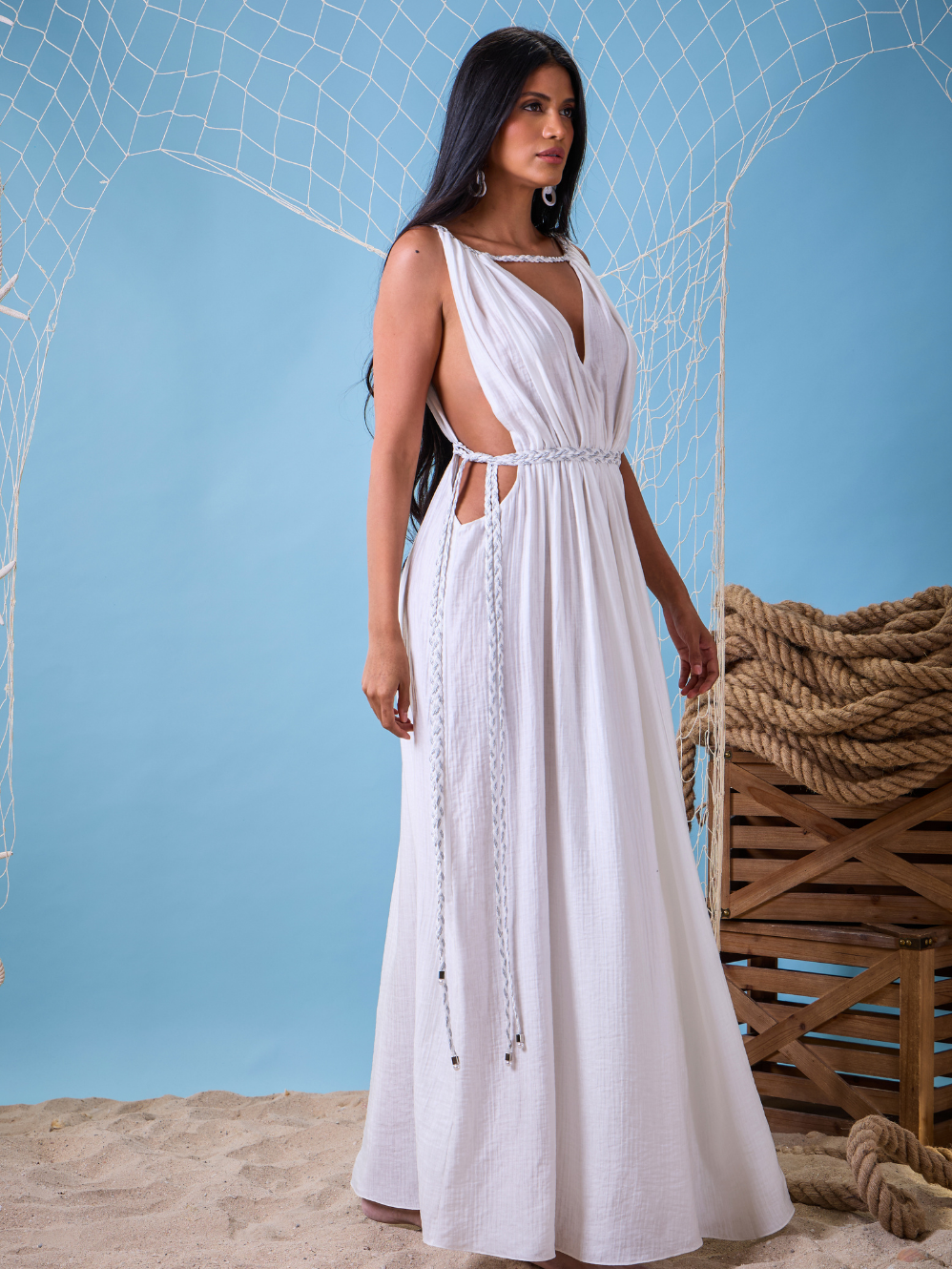 The Thalassa Dress is crafted for the goddess within you. This stunning full-length design features a plunging deep V-neckline, open sides, and an integrated decorative braided belt that cinches the waist. The flowing skirt drapes gracefully with every step, perfectly capturing the essence of divine femininity.