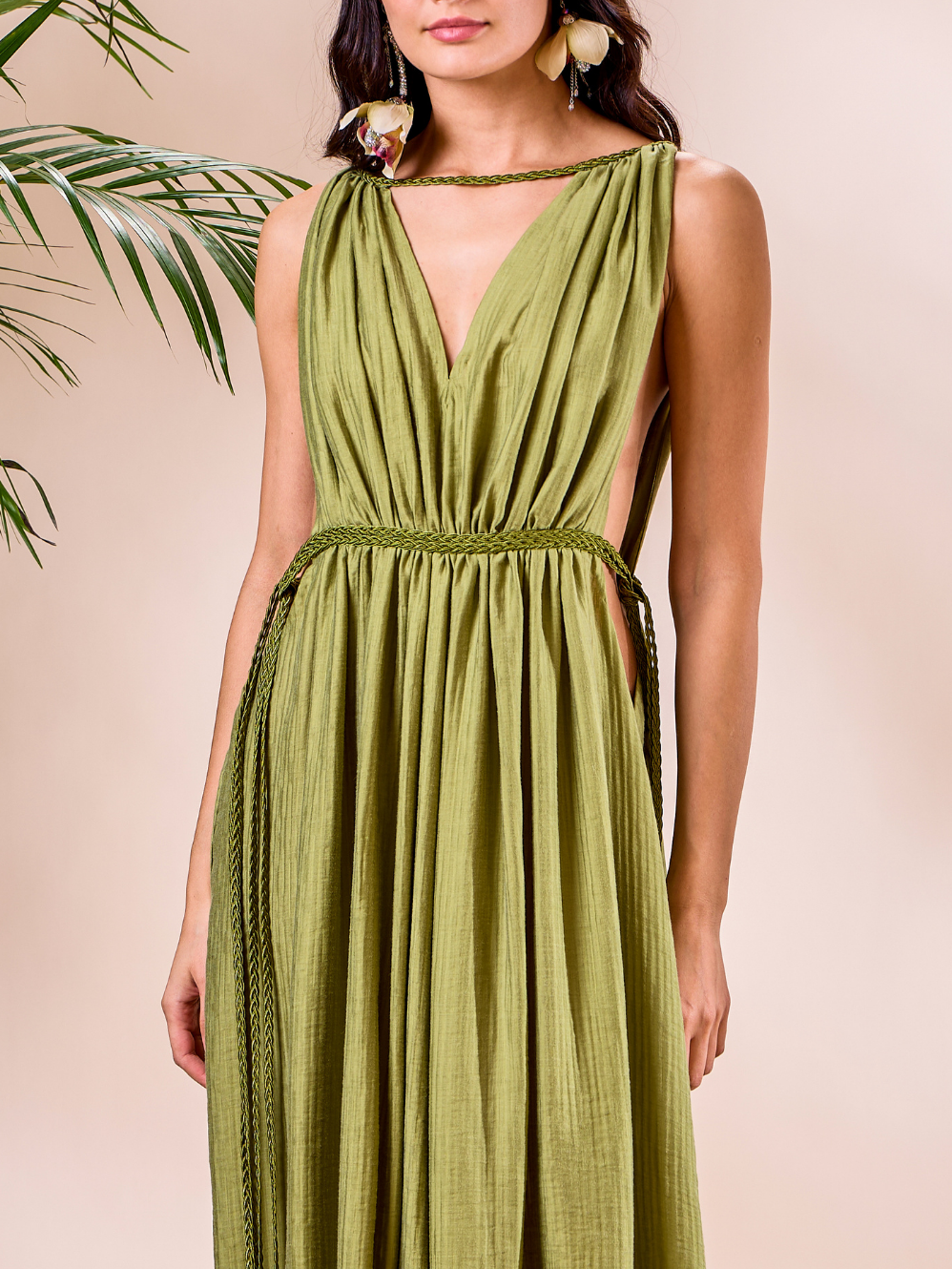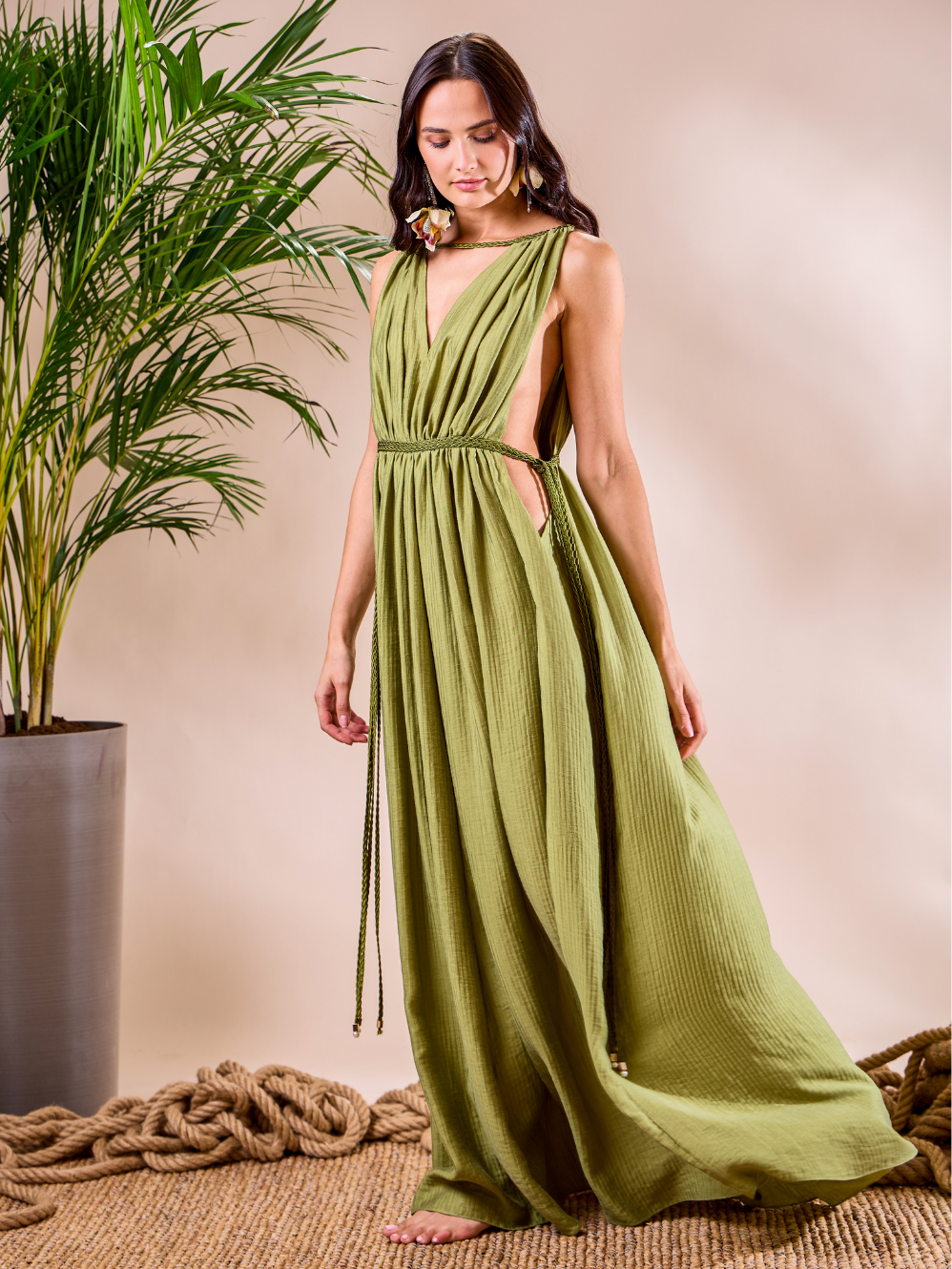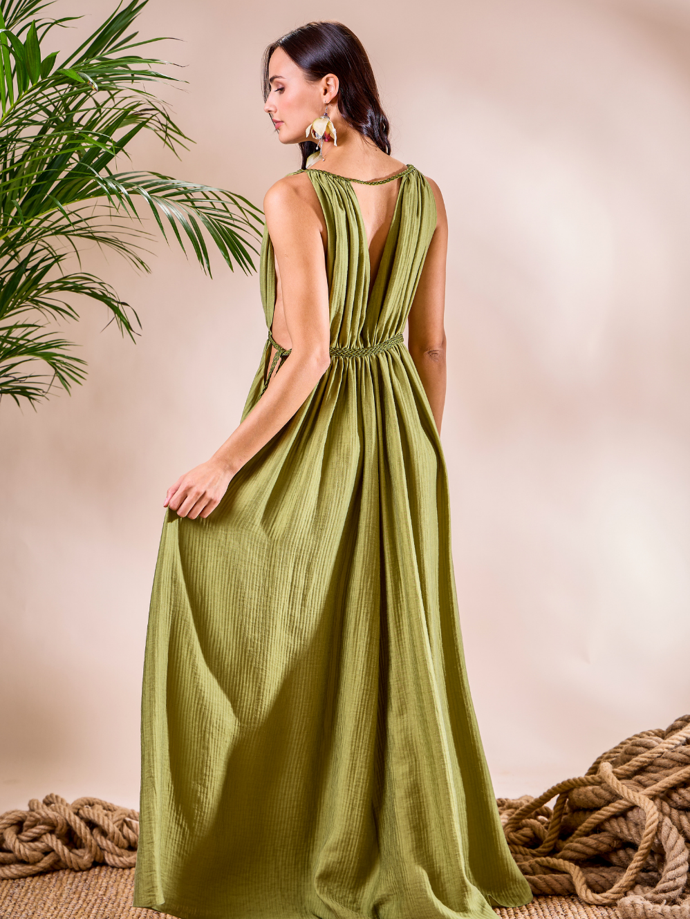The Thalassa Dress is crafted for the goddess within you. This stunning full-length design features a plunging deep V-neckline, open sides, and an integrated decorative braided belt that cinches the waist. The flowing skirt drapes gracefully with every step, perfectly capturing the essence of divine femininity.